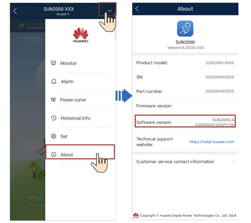 Dans l'écran de mise en service locale de l'onduleur, sélectionnez ... > À propos. Si la version du logiciel est antérieure à SUN2000L V200R001C00SPC138 ou SUN2000MA V100R001C00SPC159, effectuez l'opération de déliaison après 5.1 Mise à niveau de la version du logiciel de l'onduleur.